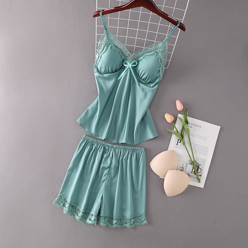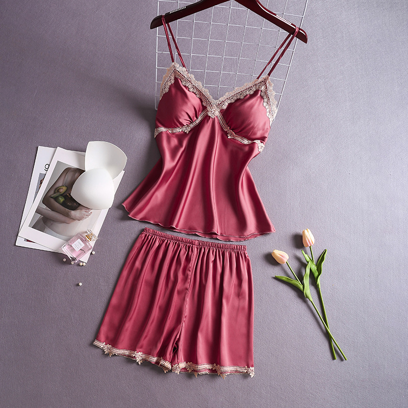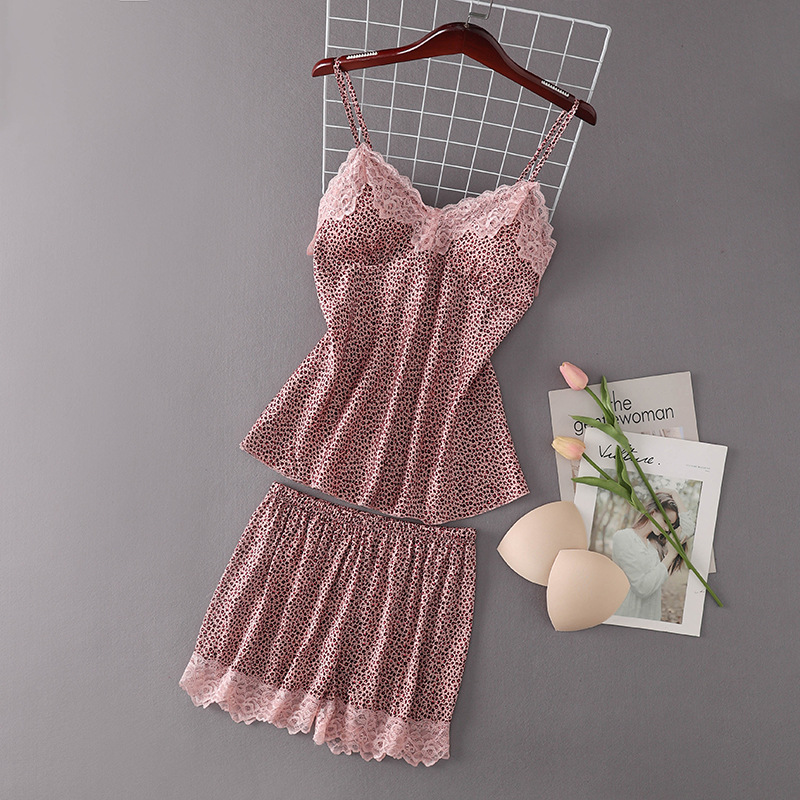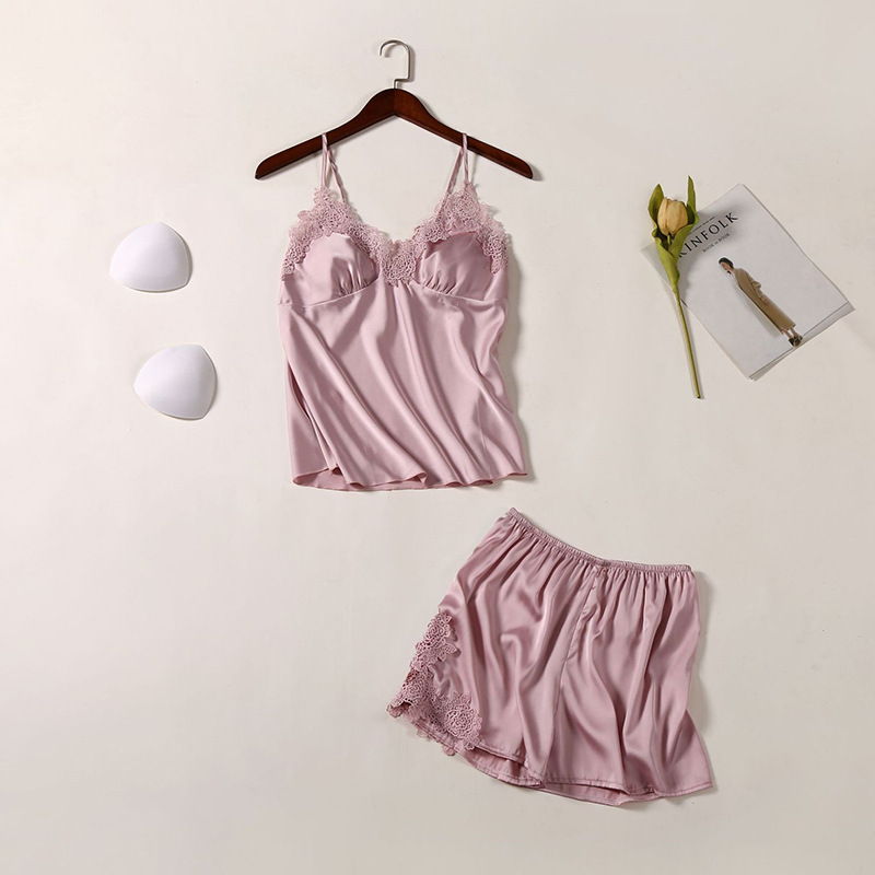 春夏季新款女仿真丝睡衣 吊带短裤家居服套装 带胸垫时尚韩版睡衣