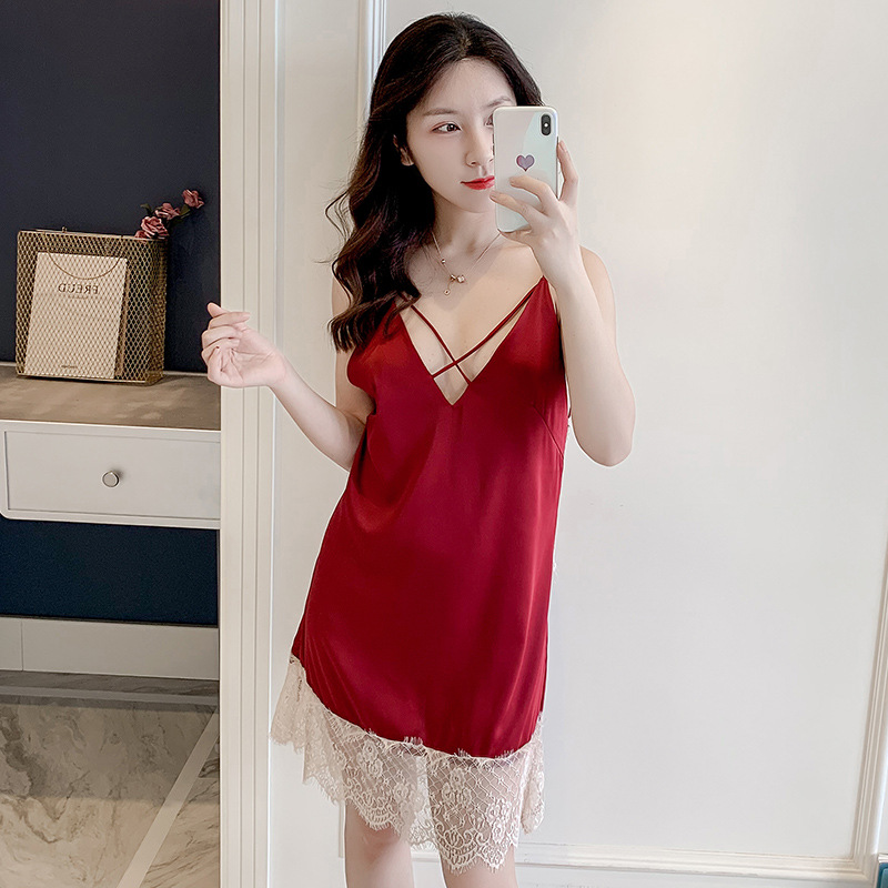 新品ins风深V睡裙 缎面雪纺家居休闲睡裙 性感吊带薄款吊带裙子