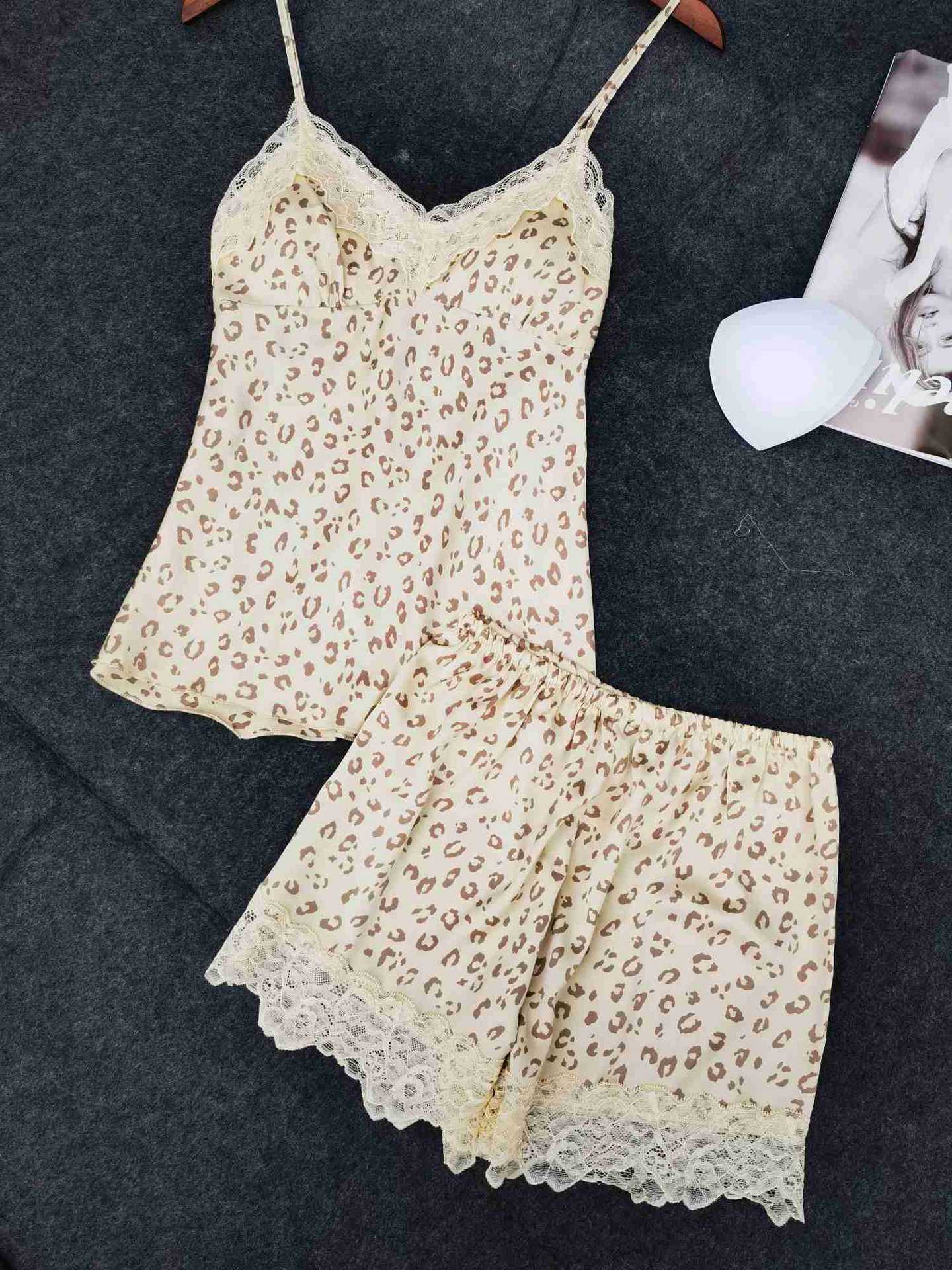 居家豹纹吊带睡裙二件套装家居服 花边性感妩媚V字领女士睡衣批发
