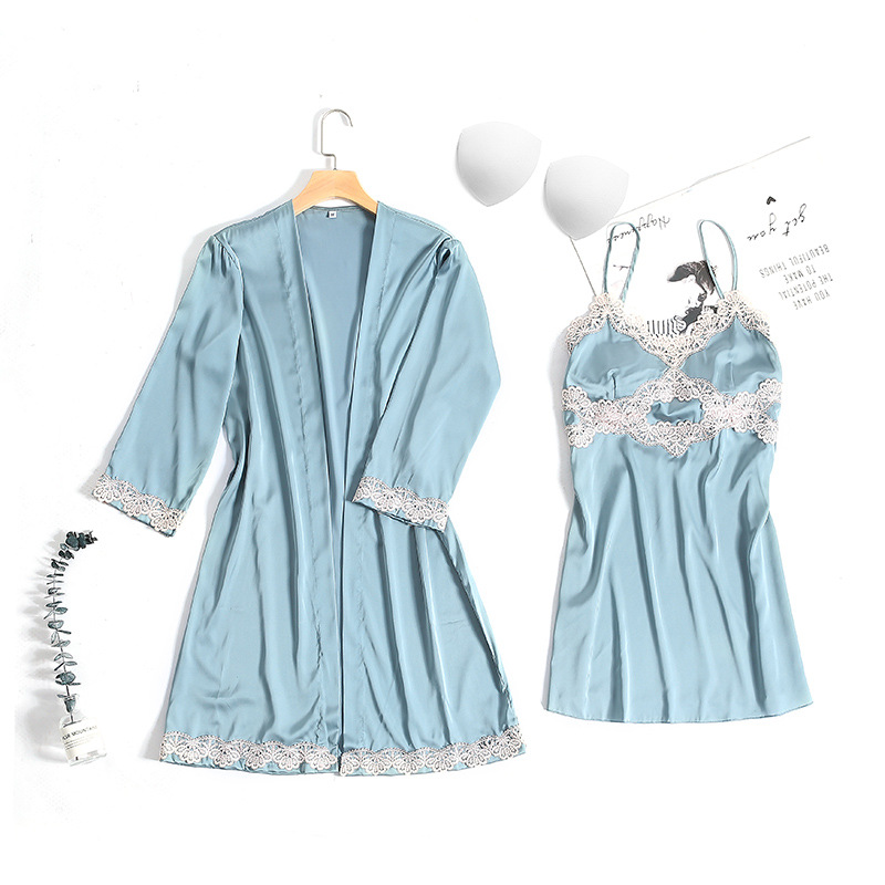 秋冬新款女士家居服两件套 金丝绒吊带睡裙 性感蕾丝开叉睡衣浴袍