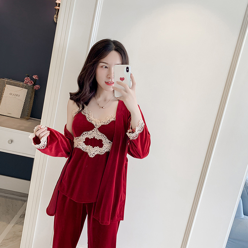 春夏秋金丝绒睡衣三件套 带胸垫舒适女士家居服 性感吊带睡衣睡裤