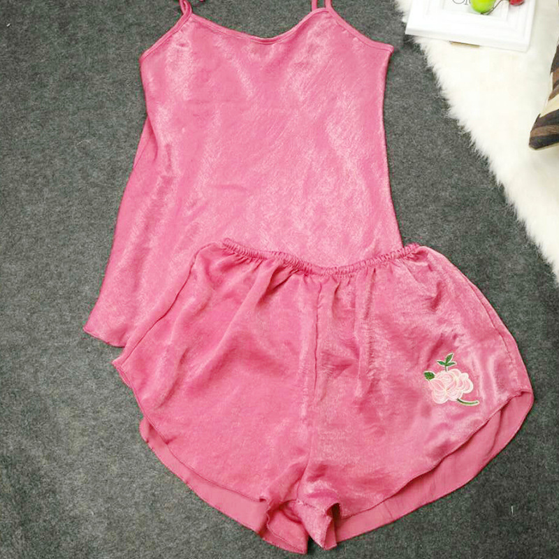 春夏新款刺绣玫瑰花睡衣 韩版吊带短裤套装 少女活泼可爱丝绸睡衣