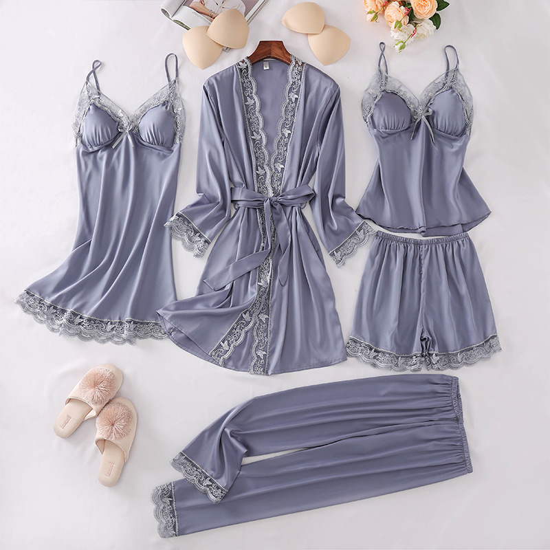 春秋夏睡衣女丝绸五件套蕾丝款长袖睡袍睡裙吊带胸垫短裤支持批发