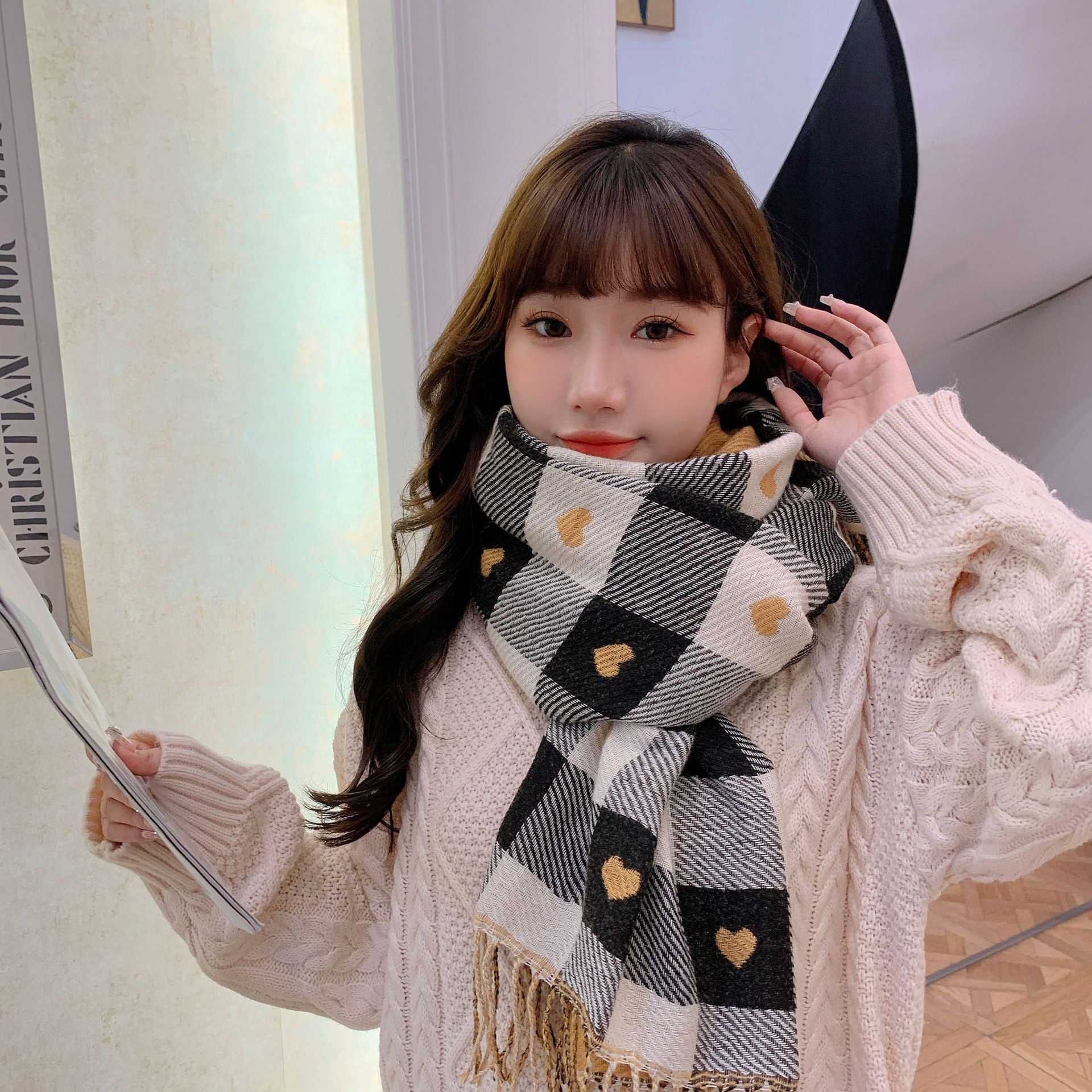 格子围巾女2025秋冬新款百搭爱心仿羊绒披肩批发加厚保暖可爱围脖