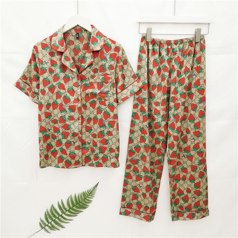 春秋季短袖长裤睡衣女 冰丝绸ins印花家居服薄款网红爆款韩版套装