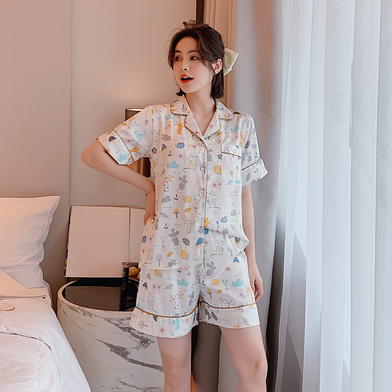 新品缎面丝绸睡衣夏季短袖短裤女士卡通老鼠仿真丝开衫家居服批发