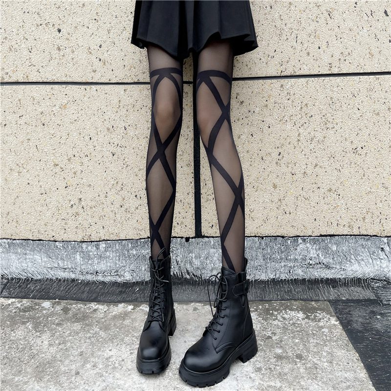 辣妹穿搭黑丝袜女性感交叉绑带连裤袜子春秋JK白丝黑色ins潮长袜