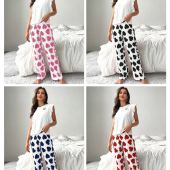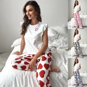 新款跨境欧美仿棉T恤桃心长裤休闲舒适女士睡衣家居服套装可外穿