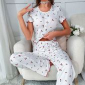 欧美跨境春秋新款印花爱心V领短袖睡衣女可外穿长裤两件套家居服