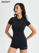 跨境现货新款短袖防晒连体泳衣平角女款泡温泉游泳馆高级感海洋色