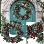 跨境圣诞节红黑格子蝴蝶结花环圣诞乡村红色仿真浆果藤圈门挂装饰