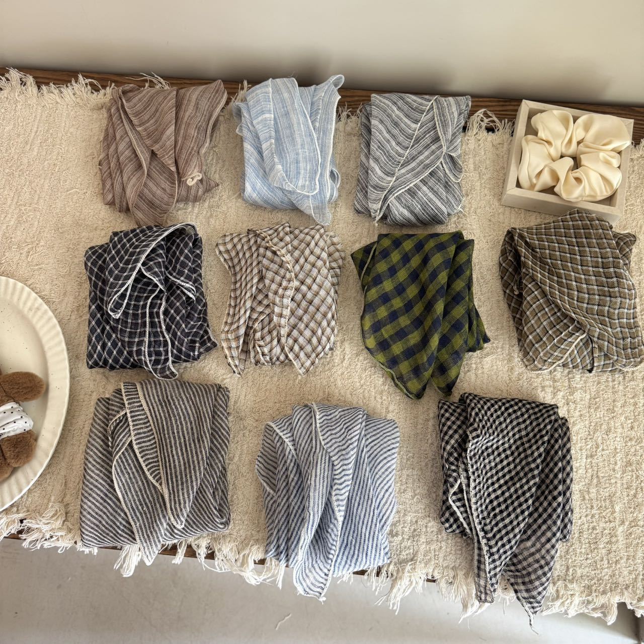 新款棉麻格条纹小方巾清新透气女柔软文艺装饰百搭春夏围巾女批发