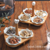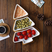 跨境供应 创意陶瓷分格果盘带竹垫圣诞树北欧干果水果糖果坚果盘