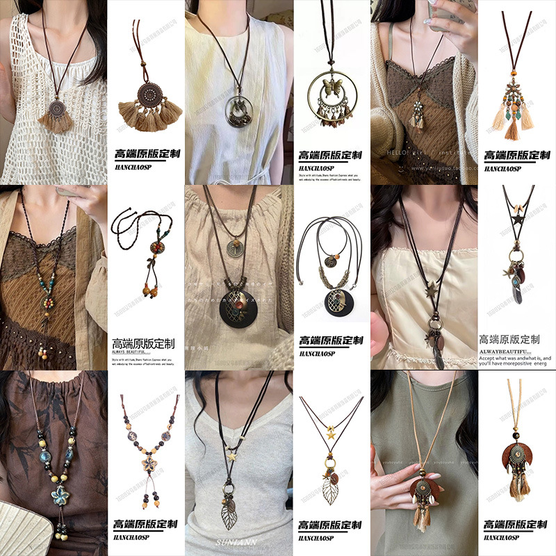 新中式禅意长款羽毛项链复古民族风陶瓷毛衣链波西米亚吊坠配饰女