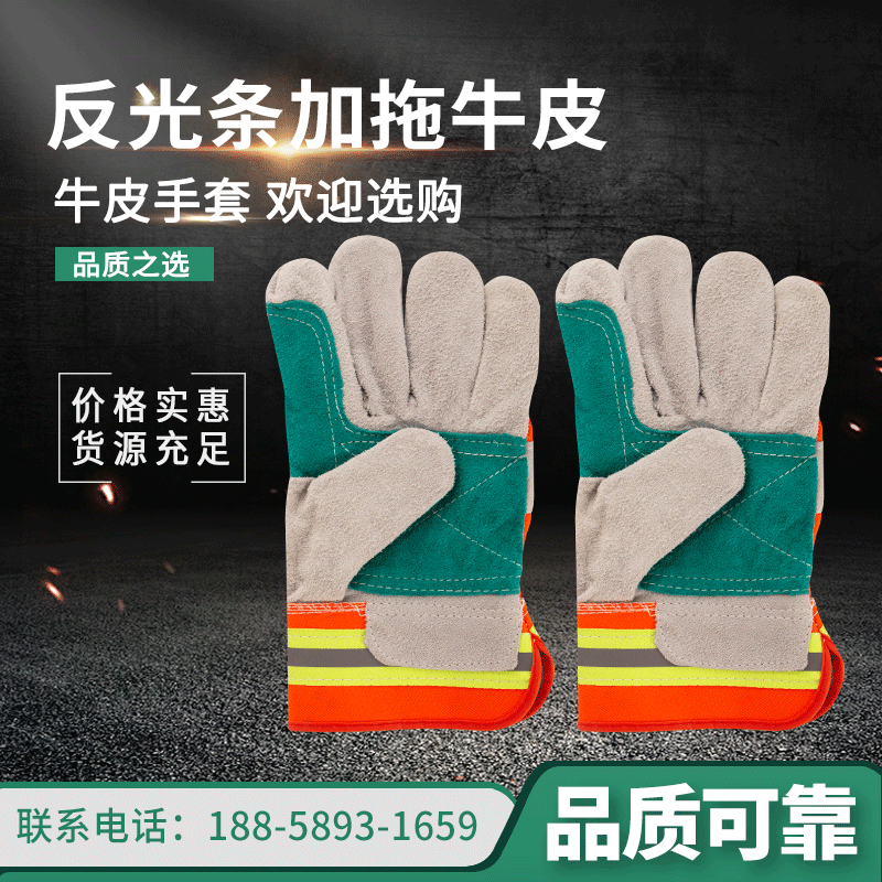 现货反光条加拖牛皮手套 劳保用品牛皮手套 工人挂胶劳保手套批发
