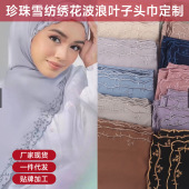 跨境新款珍珠雪纺绣花头巾批发波浪叶子披肩丝巾马来西亚花边围巾