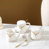 轻奢创意陶瓷杯带盖勺马克杯简约情侣杯麋鹿咖啡杯真金浮雕牛奶杯