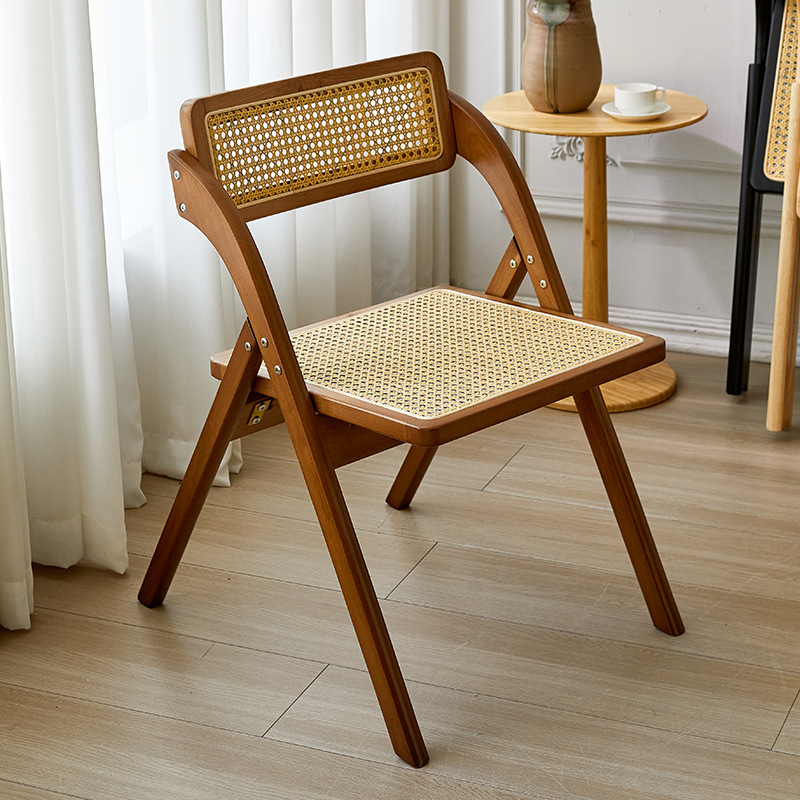 北欧实木编藤餐椅现代简约家用中古侘寂分便携式折叠藤编靠背椅子