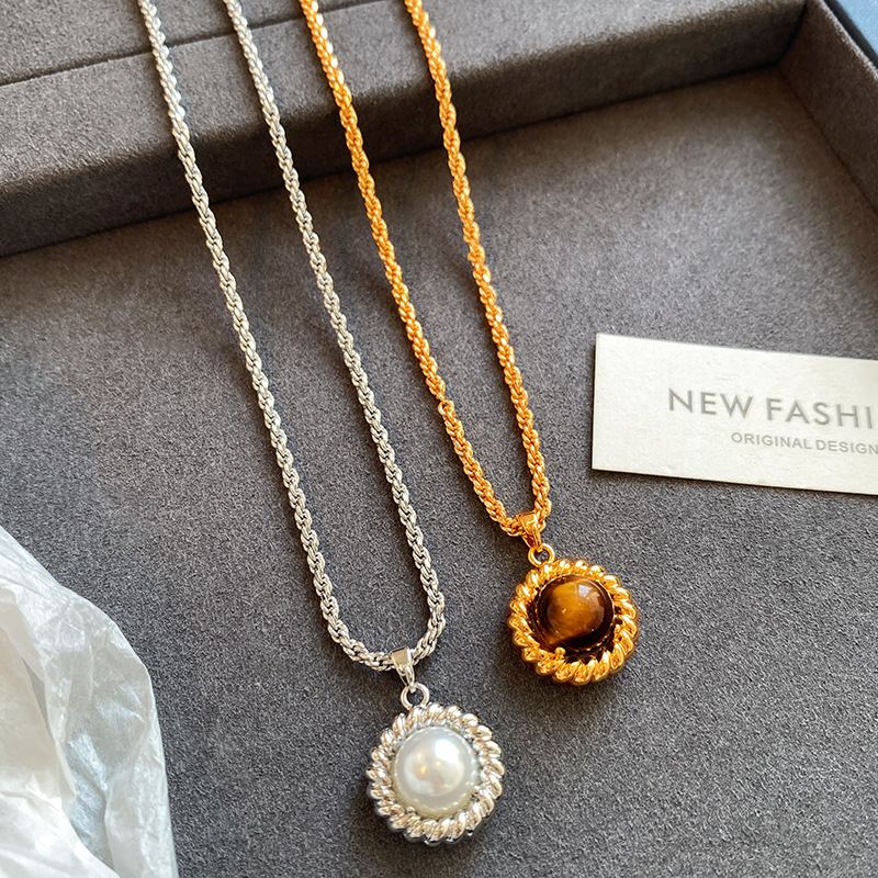 项链小众高级感珍珠吊坠秋冬长款毛衣链美拉德风天然虎眼石项链女