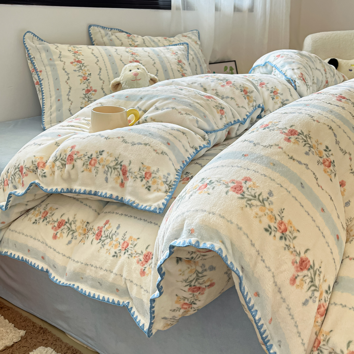 简约ins少女田园素描花三角针牛奶绒四件套冬天加厚珊瑚绒三件套4