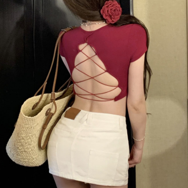 5012#人棉辣妹性感纯欲镂空绑带露背短袖T恤修身短款露脐上衣女潮