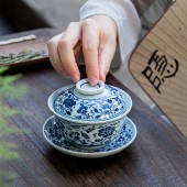 青花瓷盖碗仿古釉下手绘陶瓷盖碗大号单个三才泡茶鱼藻缠枝莲盖碗