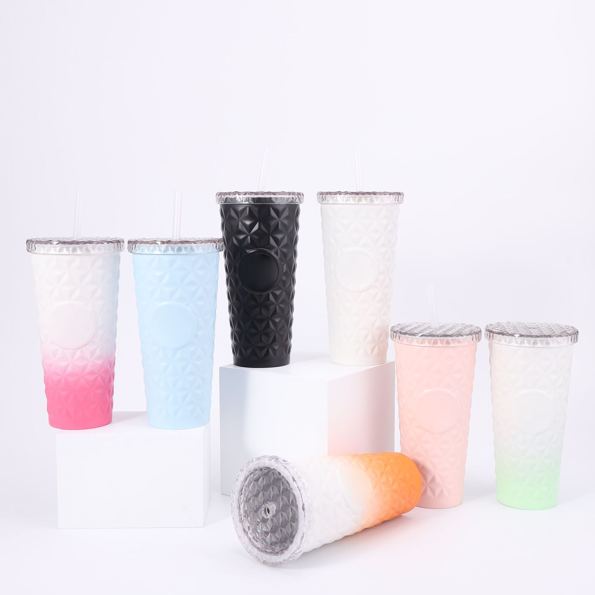 跨境高颜值榴莲杯鱼鳞杯双层塑料吸管杯户外便携大容量扎手钻石杯
