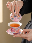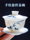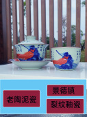 景德镇青花釉下彩老陶泥三才盖碗杯满江红家用泡茶器开片功夫茶具