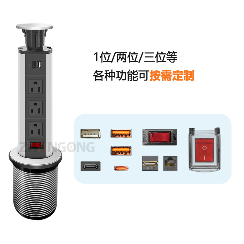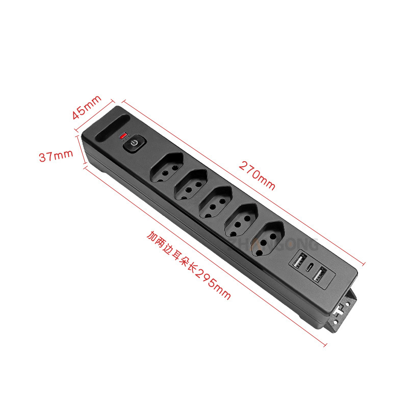 巴西5位10A拖线板插座带开关带2USB1C桌面用可固定巴西便捷式插座