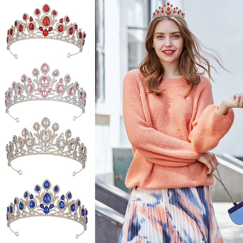 跨境新娘头饰奢华闪亮水钻选美皇冠多色水滴头饰结礼婚纱配饰发箍