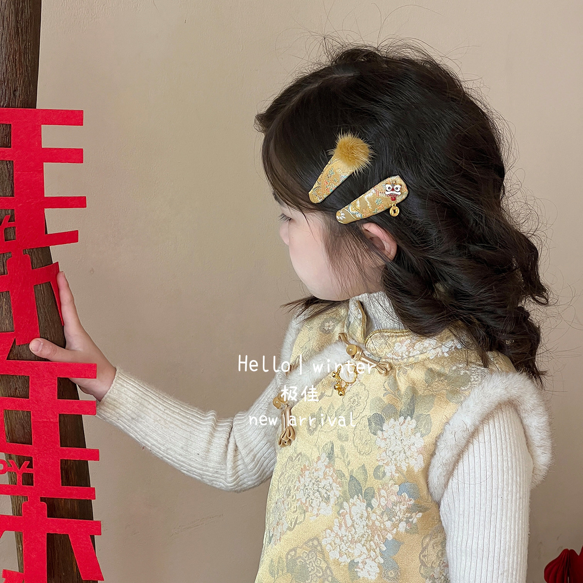 极佳新中式国风刺绣毛球发夹新年醒狮儿童BB夹喜庆拜年发卡头饰