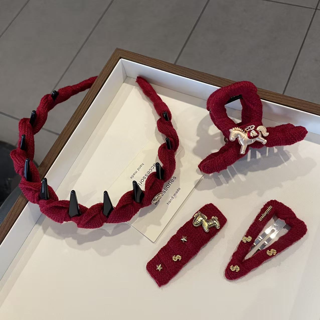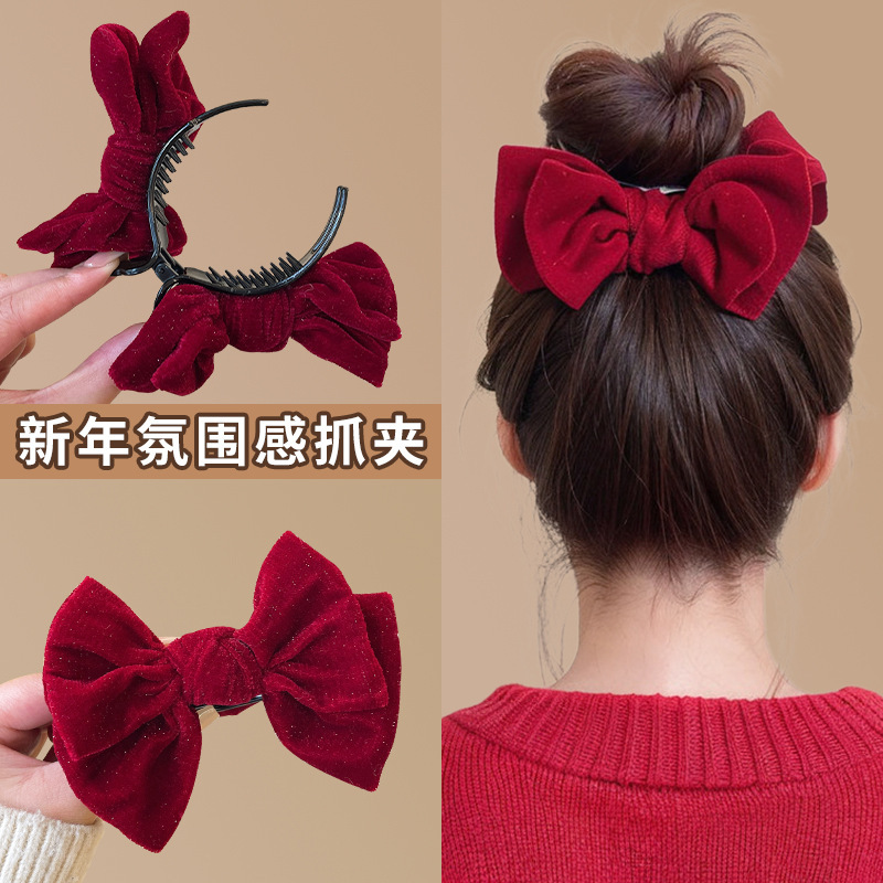 新年红毛线马年发夹头饰女秋冬气质新款过年鲨鱼夹发箍精品店发饰
