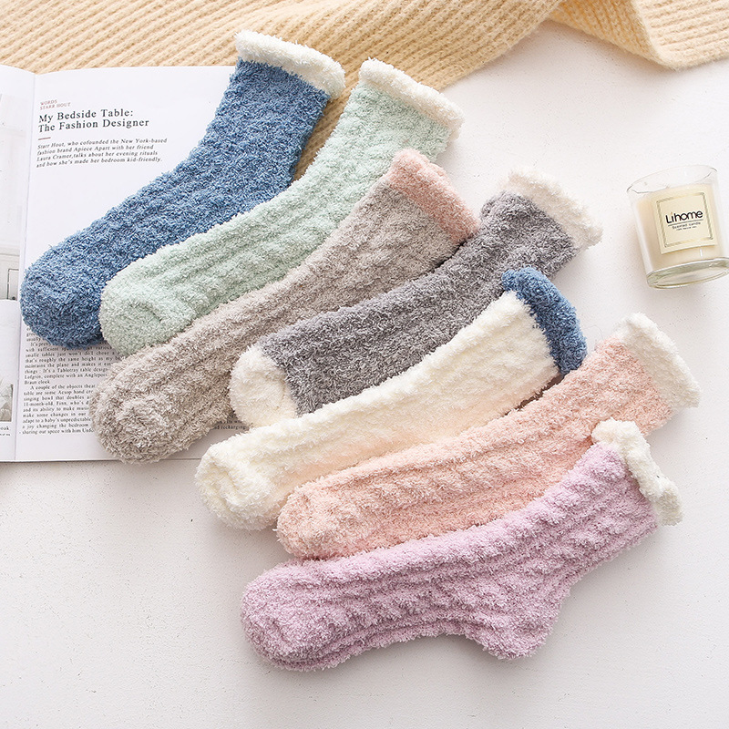 珊瑚绒袜子女秋冬季加绒加厚毛巾地板袜长筒睡眠袜保暖中筒月子袜