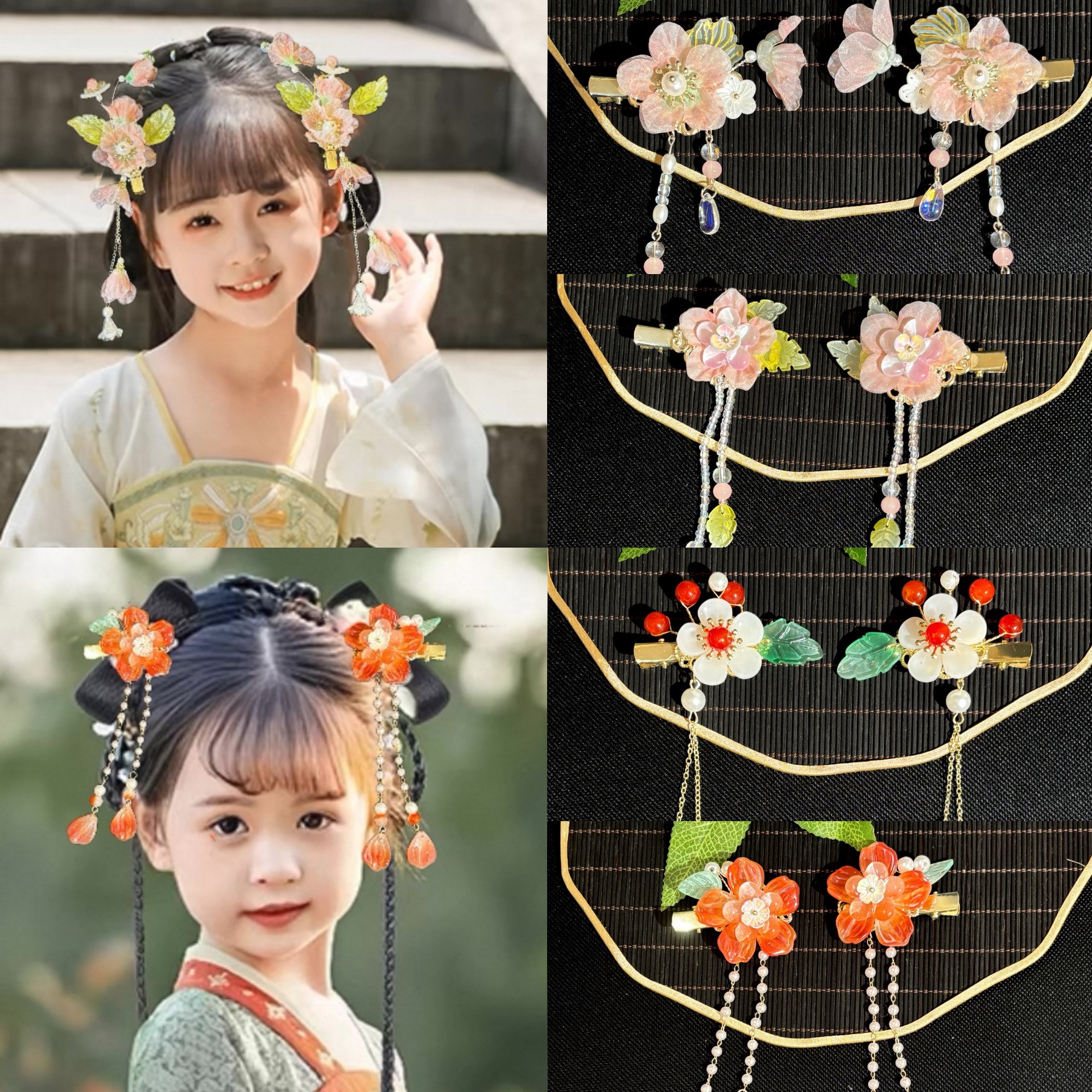汉家儿女儿童汉服头饰琉璃花朵女童古风发夹中国风甜美结流苏对夹