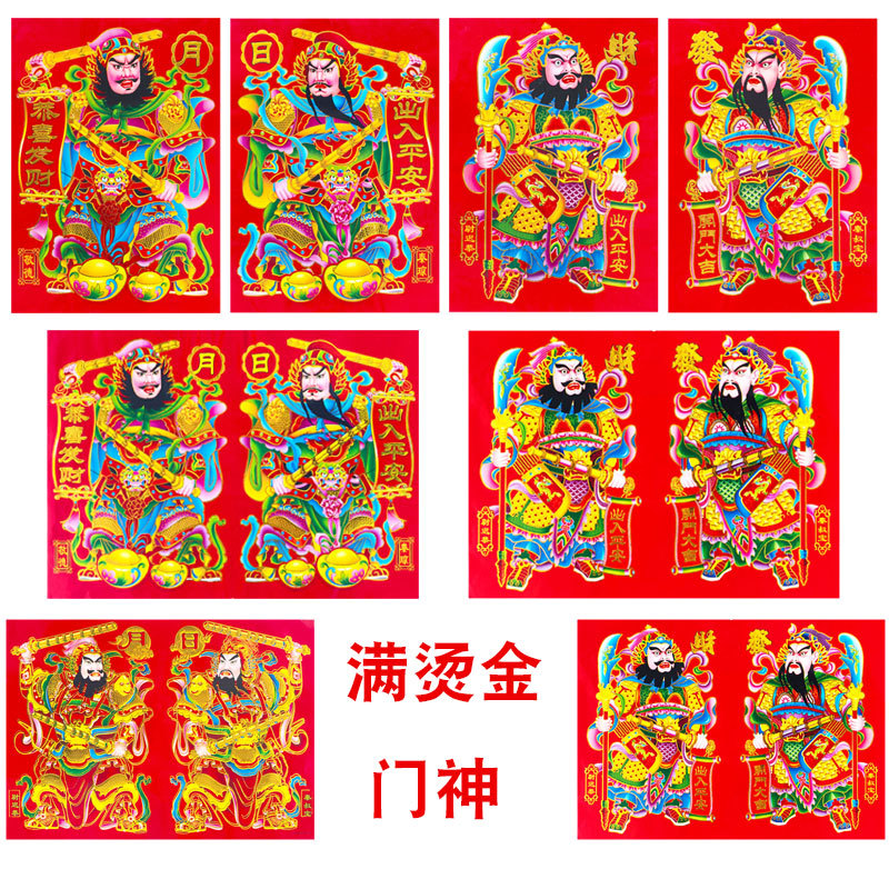 新款满烫金植绒背胶门神年画春节高档铜板纸日月发财门神年画批发