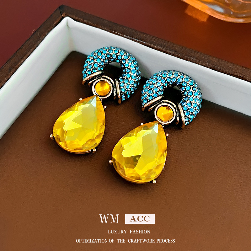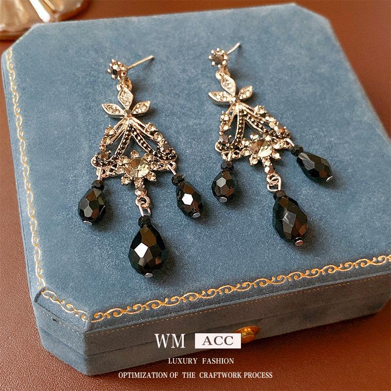 中古vintage锆石耳环银针夸张重工花朵水滴耳钉轻奢高级感耳饰女