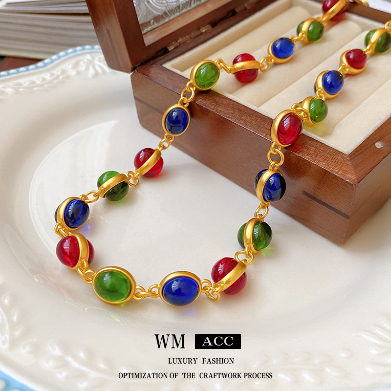 中古Vintage项链复古文艺时尚小众设计感颈链 彩色椭圆项饰女批发