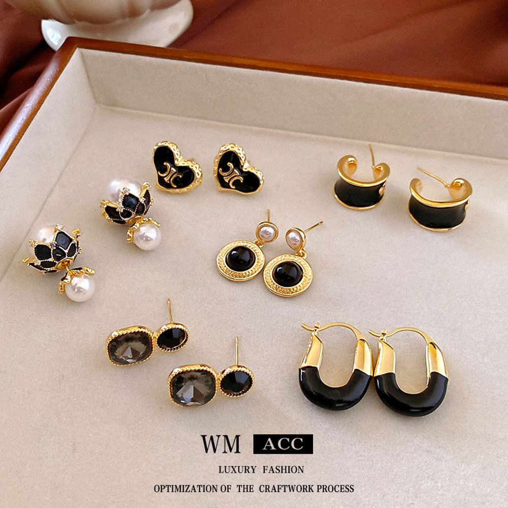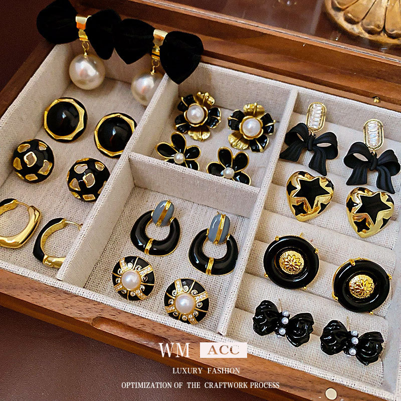 中古vintage个性耳环 银针黑色滴油珍珠耳环法式复古设计耳饰批发