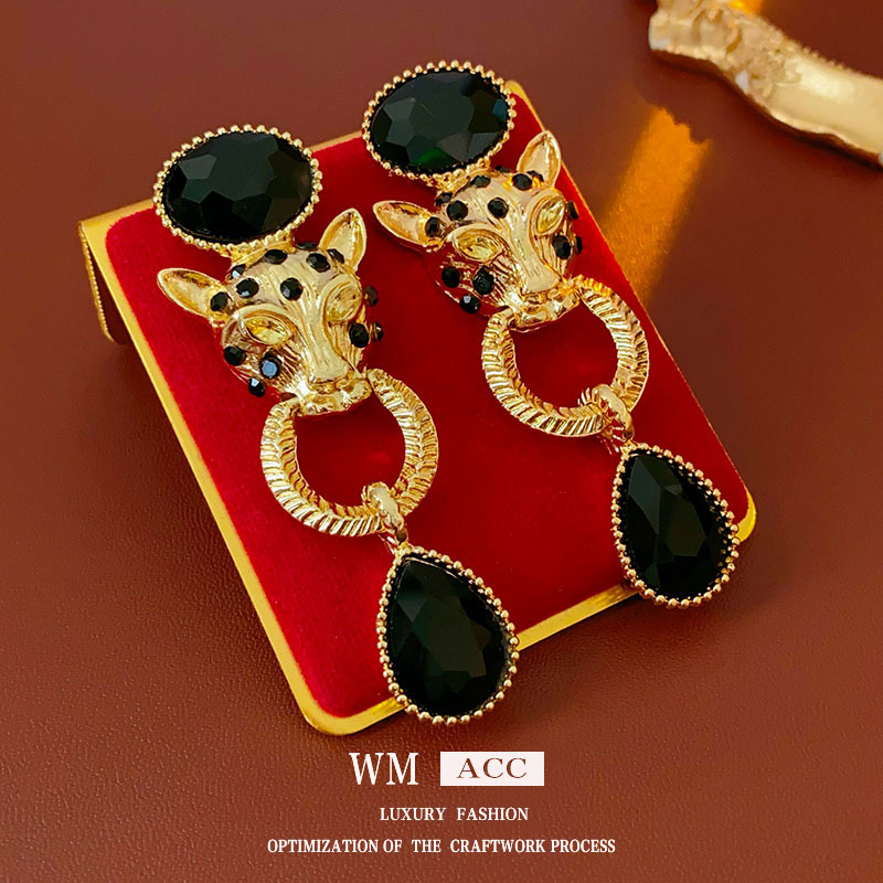 中古vintage银针耳钉 镶钻老虎头水滴吊坠耳环百搭高级感个性耳饰