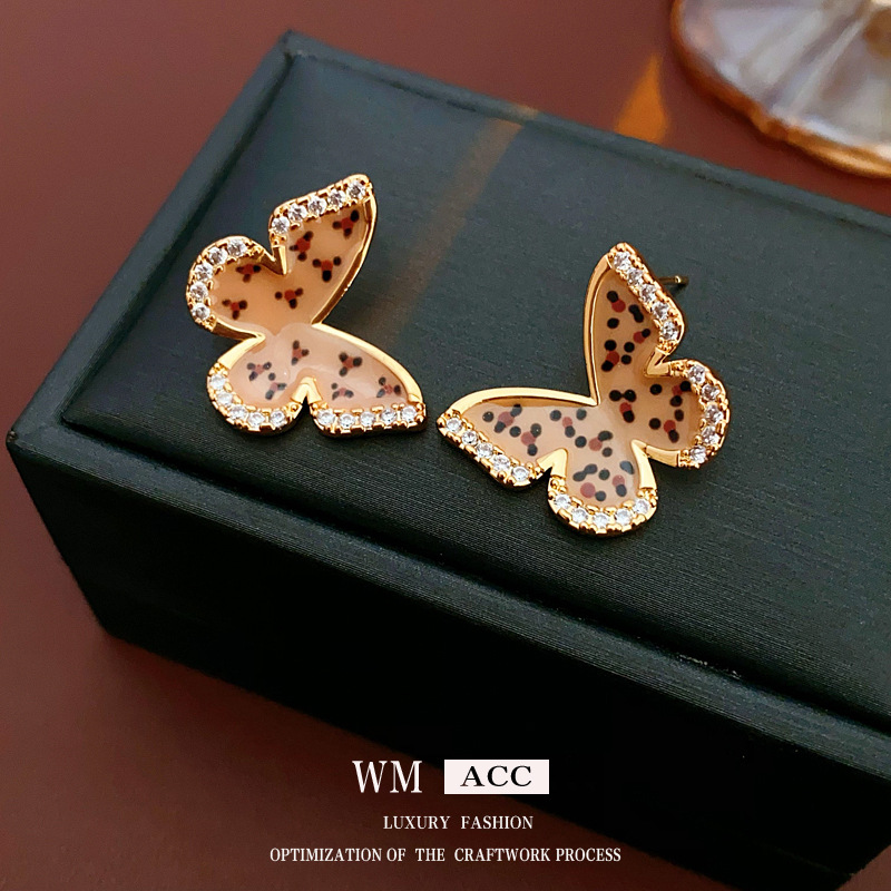 中古vintage银针耳环真金电镀锆石滴油波点蝴蝶耳钉气质高级感饰