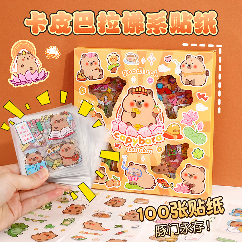 卡皮巴拉手帐贴纸可爱水豚PET防水贴画女孩儿童咕卡贴纸100张套装