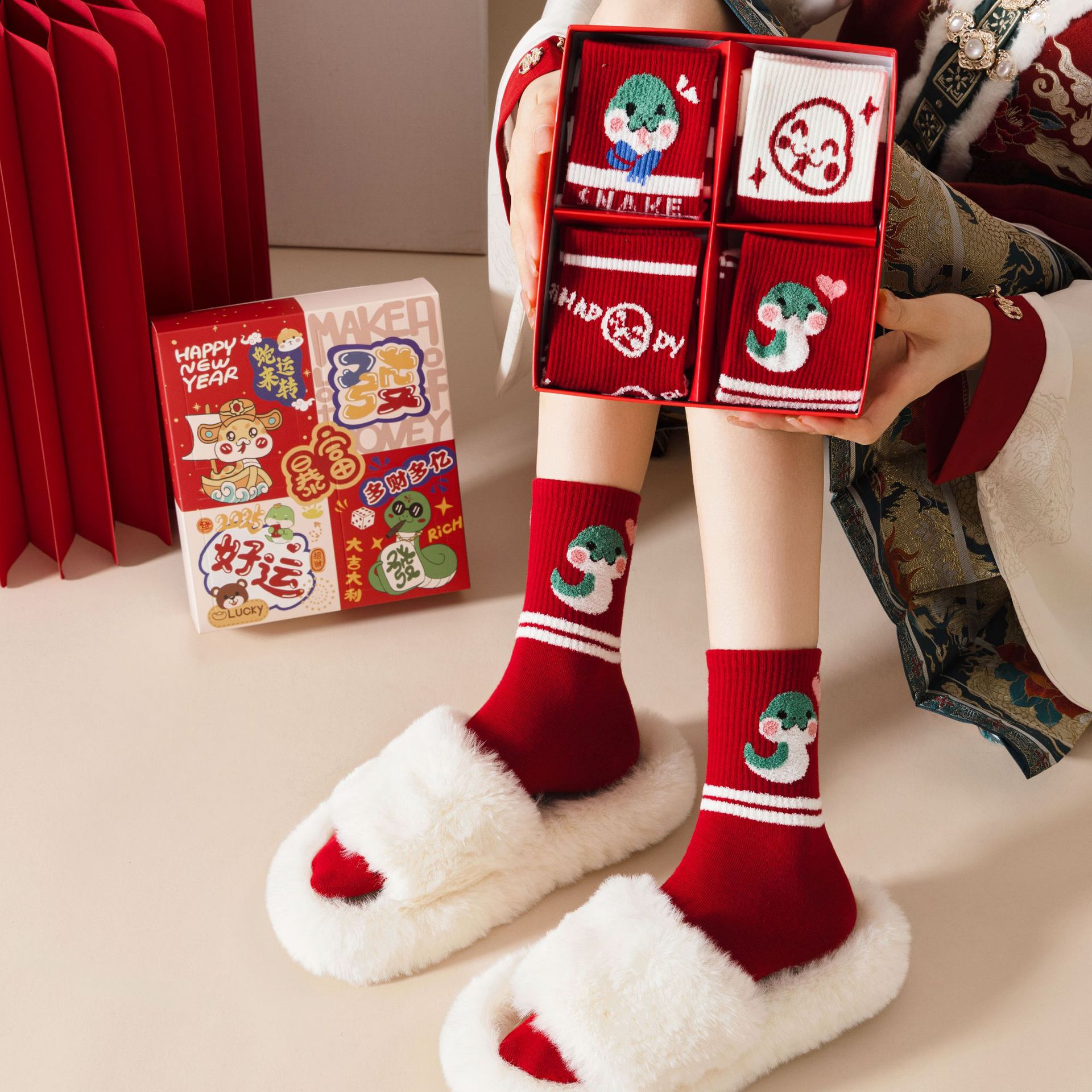 蛇年红袜子本命年大红色新年袜礼盒男女吸汗中筒棉袜卡通礼品批发
