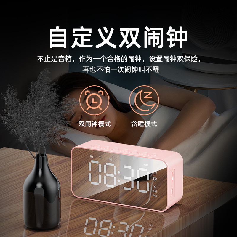 跨境新款无线蓝牙小音响便携式桌摆简约LED镜面数字时钟插卡礼品