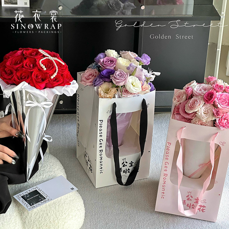 花衣裳防水梯形马卡龙手提袋菱格压纹插花手提盒花店沙龙小花束材