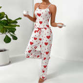 欧美跨境睡衣女热销坑条爱心性感时尚吊带背心长裤家居服两件套装