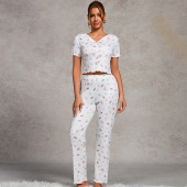 跨境亚马逊欧美短袖v领睡衣小碎花印花生菜卷边长裤家居服套装女