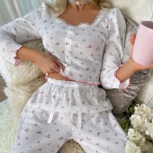 欧美跨境热销睡衣女士性感深v印花修身长袖纽扣时尚上衣长裤套装
