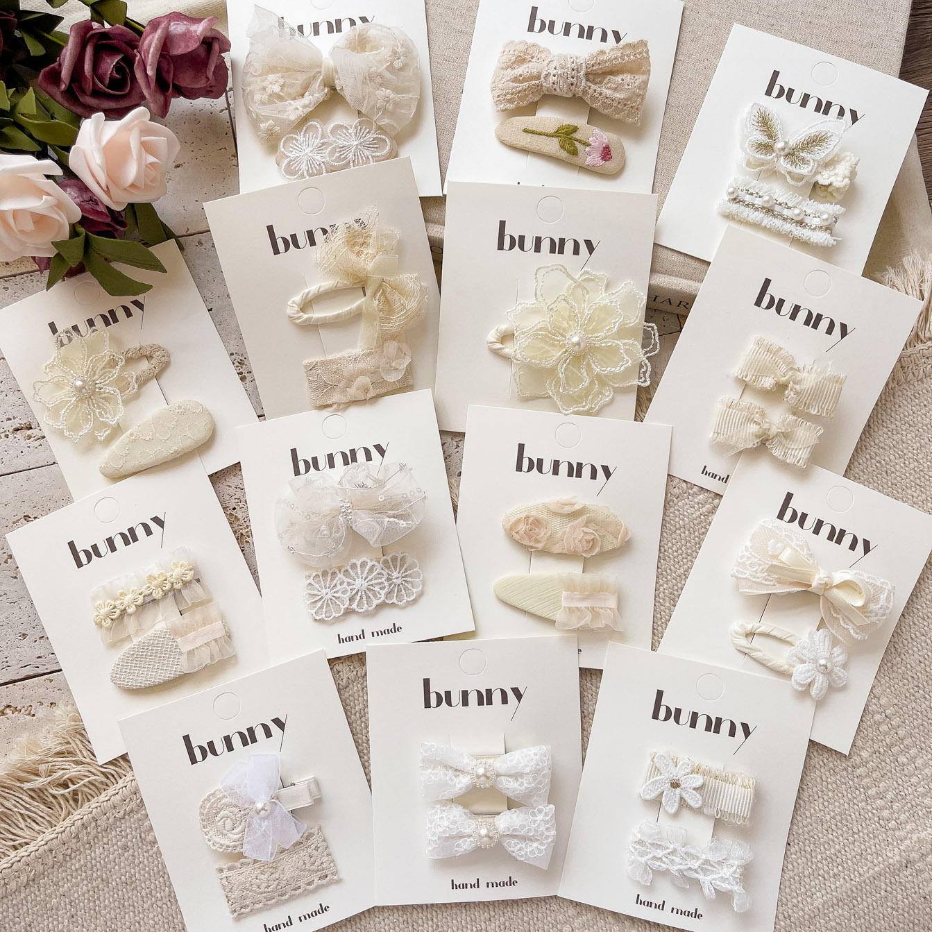 法式复古风米白色布艺蕾丝发夹花边蝴蝶结毛线编织花朵刘海边夹女