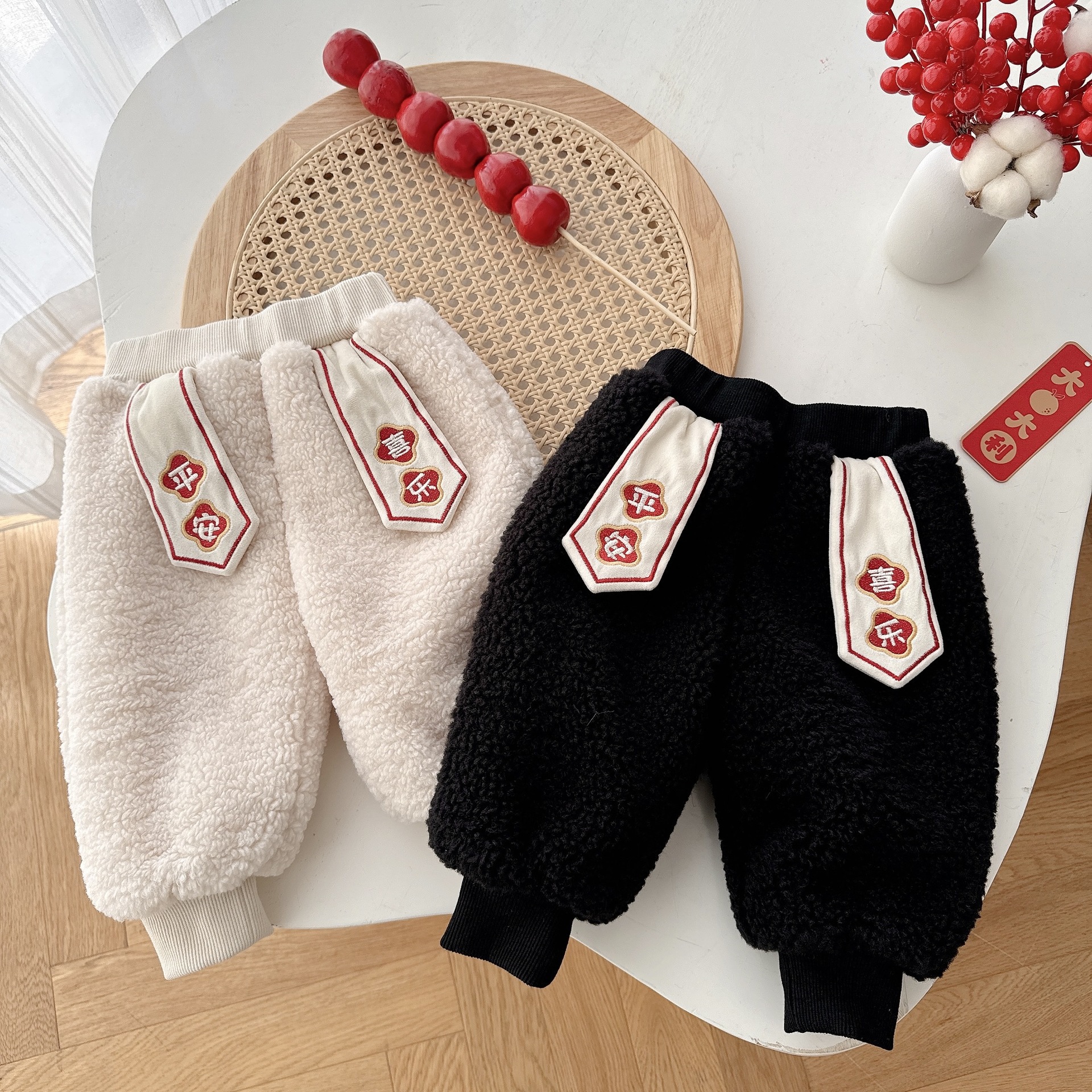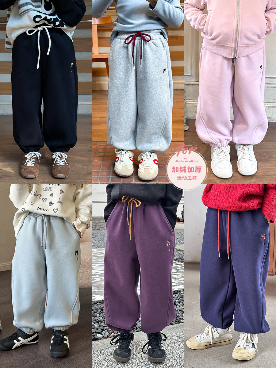 儿童中国风加绒裤冬季a类男童加绒卫裤女童刺绣裤子拜年服潮AK495