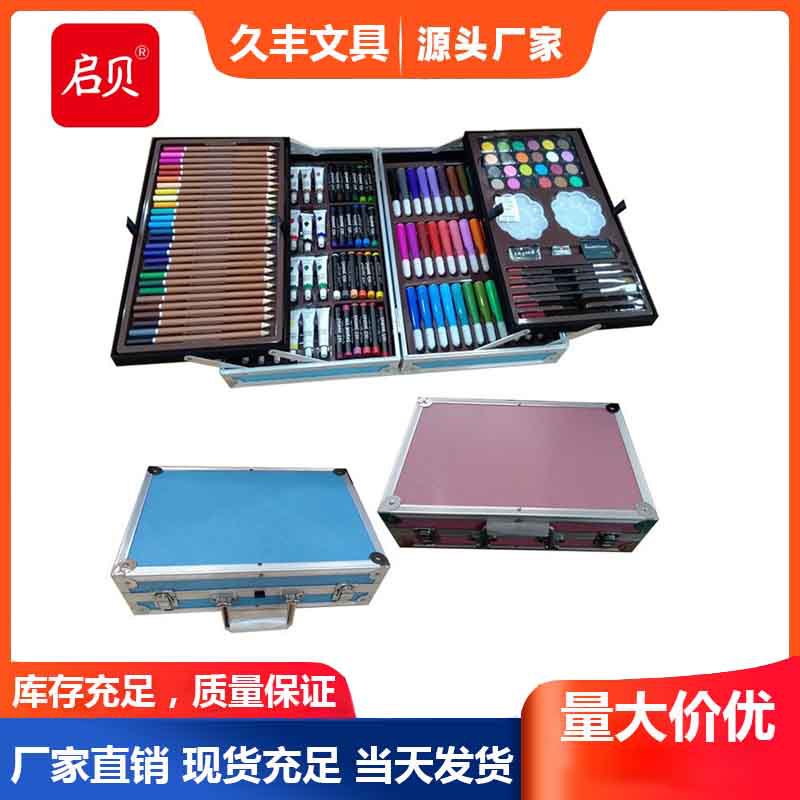 工厂供货儿童彩笔粉蓝色145件套双层铝盒绘画套装批发画画工具